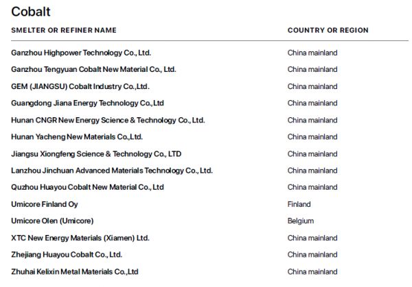 图:最新的苹果冶炼与精炼供应商列表显示,钴的供应商基本来自中国大陆,其中格林美、华友钴业、腾远钴业等上市公司都拥有很大的再生钴产能。