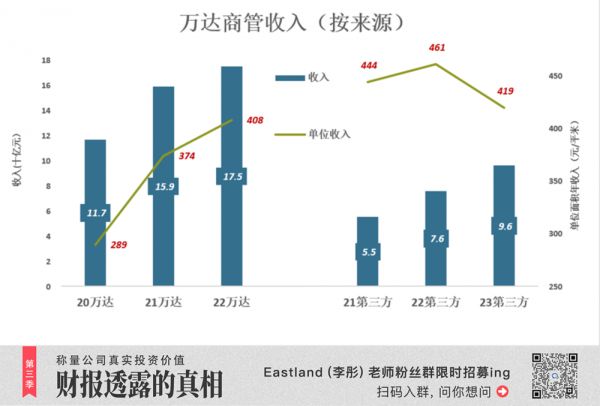 2020~2022年,来自独立第三方的收入分别为55亿、76亿、96亿。期间管理面积增加了84.5%、收入只增长了74.4%。每平米年收入从2020年的444元降至2022年的419元。