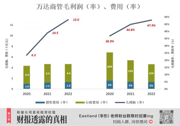 2022年,万达商管毛利润130亿,较2020年提高105%;销售费用、行政费用合计46.6亿,较2020年增长不到7%;