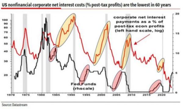 就像上面这个图说的,联储加息后,有一个滞后效应,才会让企业的融资成本上升,而今年这个数字还是下降的。这张图我觉得是比较好解释说为什么从加息到停止加息,到萧条,中间会有一些间隔。货币政策传导需要时间,而企业的融资成本是个很好的观察指标。