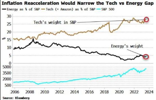 关于股票,依然对科技股报有很多信心,原因一方面是上面这个利率,另一方面,这些科技公司的权重确实比能源公司大太多了。