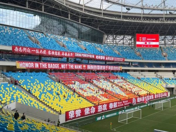 北看台呈现着“中国”两个汉字的巨型TIFO早已在赛前被球迷志愿者们准备好,与之相对的南看台则展开着一面巨幅国旗,加上二层看台上随处可见的横幅——可以说,刚一踏入场内就被浓浓的民族自豪感所环绕。
