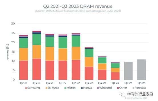 据Yole统计显示,自 2021 年第三季度以来,DRAM 价格已下跌 57%(2023 年第一季度为 0.54 美元至 0.30 美元)。供需失衡(以及随后的价格下跌)背后的主要驱动因素是客户耗尽高库存和供应商生产过剩(这是由新冠病毒时代需求激增推动的)。