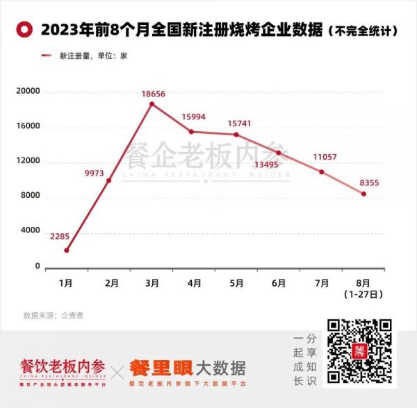 企查查数据显示,上半年“烧烤”新增95000家,其中“集中爆发”的时间为3~5月,从6月开始逐月递减。