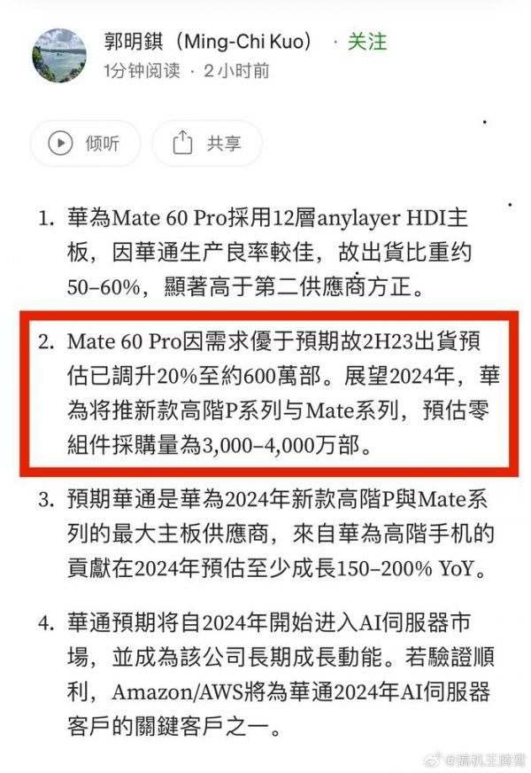 郭明錤预计华为Mate60 Pro一年内至少卖1200万部