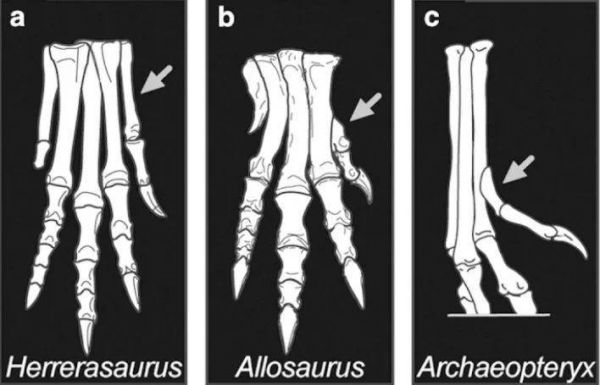 a最古老的埃雷拉龙;b特异龙;c始祖鸟