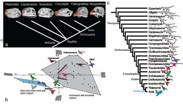 鸟类与恐龙的亲缘关系,以及喙的变化,可以看出一个连续的演化历程: