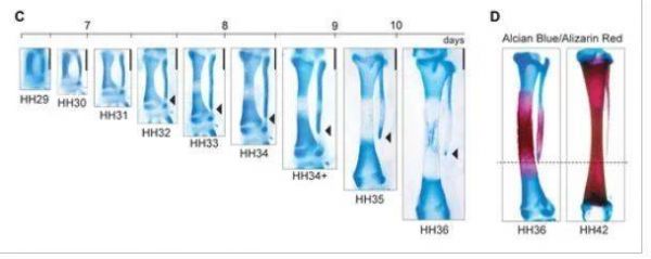 研究团队,同样通过标记法,研究了鸟类骨骼胚胎发育过程中,腓骨的变化过程: