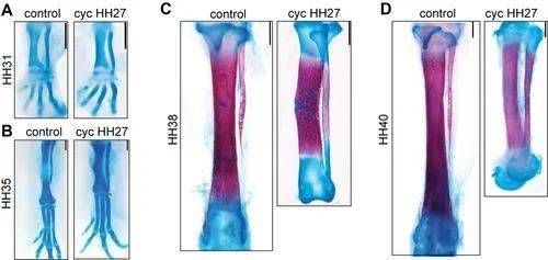 研究团队通过染色标记的方法确定胚胎中各类软骨发育的位置,以及大小。