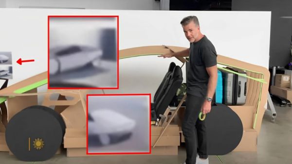 这两天一档CBS电视台关于马斯克的节目,在谈及特斯拉设计总监Franz von Holzhausen的画面中,意外露出了一辆纸板搭出的新车模型,背景左边缘依稀可见设计草图。