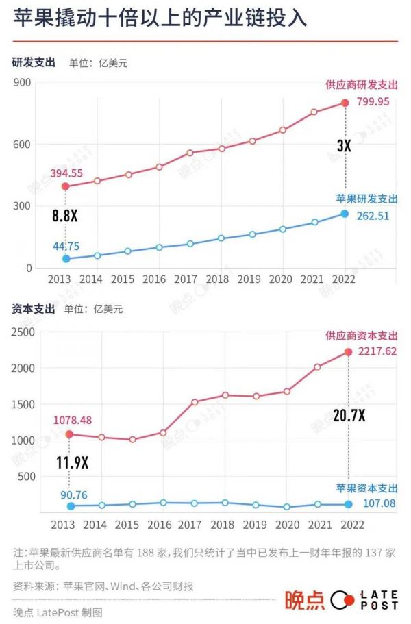 负责把苹果提出或研究的新技术、制造工艺或者新材料变成 iPhone 零部件的供应商们投入更多。2022 年,137 家上市的苹果供应商研发投入和资本开支达到了 3000 多亿美元。