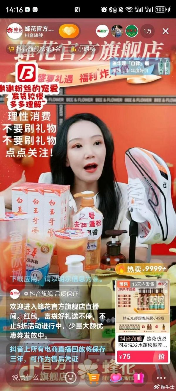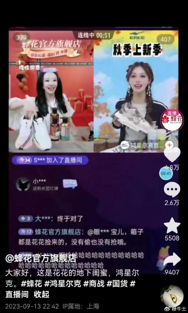 据悉,9月13日晚,鸿星尔克在直播间卖蜂花的上海硫磺皂,产品展示台还摆放了蜂花产品,主播用鸿星尔克商品鞋带着蜂花洗发露直播洗头,鼎力推荐为蜂花打广告,直播间几万人在线观看。随后蜂花直播间也摆上了鸿星尔克的鞋子,并发视频配文称:“大家好,这是花花的地下闺蜜,鸿星尔克。”