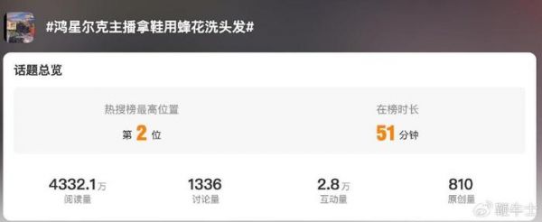 鞭牛士 9月14日消息,今日,一条名为“鸿星尔克主播拿鞋用蜂花洗头发”的话题登上微博热搜。截至发稿,话题已登上热搜第二位,阅读量超过4000万。