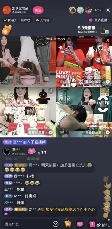 在这波热度下,各大直播间也开始纷纷上演“洗头”表演。其中,加多宝与蜜雪冰城、今麦郎等品牌直播连线时,加多宝现场表演倒立洗头,今麦郎用锅洗头,收割一波粉丝的关注。网友评论称“太拼了”。