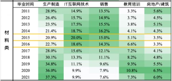 从时间来看,材料类同学在2015年、2016年是“转码”的高峰期(其他天坑专业也是这样),在那之后“转码”的比例就已经开始逐年下降了。2021届进入生产制造领域的比例已经到了37%,相比最低点接近翻倍了。