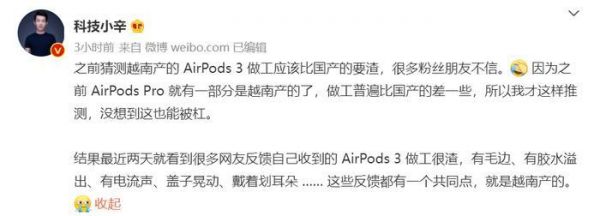 图片来源:微博不知道大家还记不记得2021年底越南产AirPods 3大面积“翻车”的场景:不少消费者在收到AirPods 3后发现这批并不是大家熟悉的中国制造,而是产自越南工厂。而且耳机做工参差不齐,有的毛边四溢,有的有胶水残留,有的甚至有明显的电流声,“甚至不如华强北高仿的品质”。