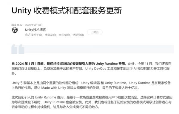 Unity宣布,将于2024年1月1日开始征收运行时费用“Unity Runtime Fee”,届时,Unity将根据应用安装量和过去12个月的营收进行收费。
