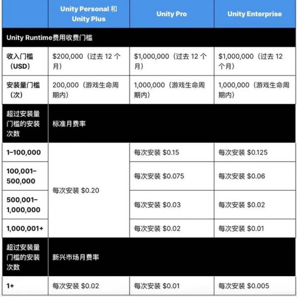 对于从2024年1月1日开征的运行时费用,任何采用Unity引擎(包括Unity编辑器和Unity运行时)的游戏都将根据过去12个月的营收和终身安装量产生新的费用。符合征收标准的用户阈值如下:Unity Personal或UnityPlus:20万美元营收和20万安装量;Unity Pro:100万美元和100万安装量;Unity Enterprise:100万美元和100万安装量。