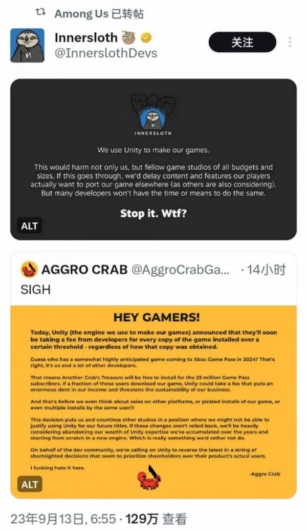 此消息一出,不少独立游戏开发者最先做出了反应。包括《Among Us》制作组在内的许多开发者们纷纷表示正在考虑会转投其他引擎,因为花钱雇人来移植/重写代码的费用要“远远小于继续使用Unity会带来的头痛”。