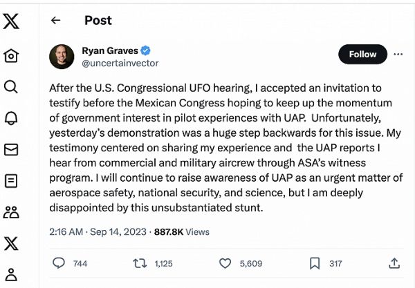 另一位当事人的最新发声也似在撇清关系。除了莫桑,美国海军前战斗机飞行员格雷夫斯(Ryan Graves)也出席了墨西哥听证会,他在会上分享了自己早前与一次不明飞行物近距离接触的经历,并称此类事件被严重低估。实际上,他曾在7月的美国听证会上作了类似证词。