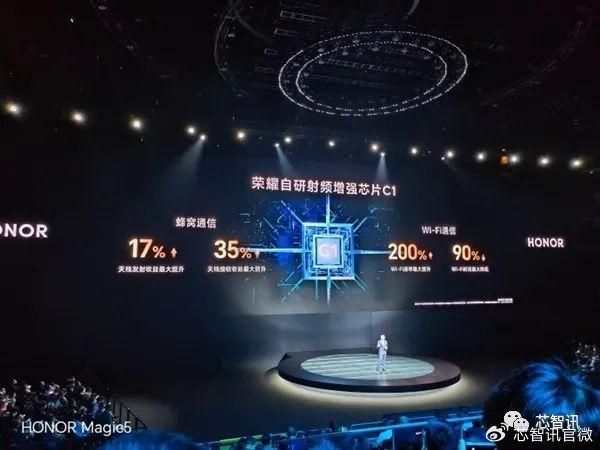 在今年3月的荣耀Magic 5系列发布会上,荣耀首次曝光了其自研的业界首个射频增强芯片C1,并由荣耀Magic 5 Pro/至臻版首发搭载。荣耀称该芯片可以极大的提升蜂窝网络、WiFi、蓝牙的信号强度,可以在地库、地下室等弱信号场景,实现快速回网、直播不卡顿、弱网下长时间通话等优势。