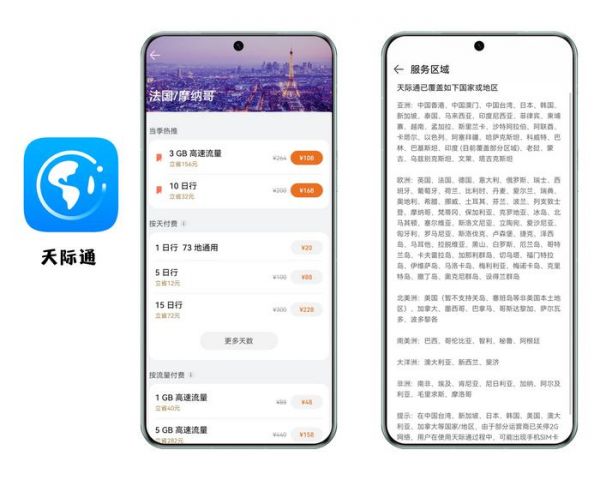 此外,华为旗下的天际通提供了海外上网的便利,让用户在海外旅途中也能保持畅通无阻的网络连接。天际通还支持无网购买,出国后没有网络的用户不需要着急打开漫游,可以在天际通APP使用无网购买通道,启用套餐后即可上网。