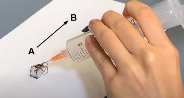 研究者首先把狼蛛冻死获得蜘蛛尸体,然后在它的头胸部刺入针头,让液压系统连通外界,然后再用强力胶将针眼周围密封。接下来,只要注入少量空气改变压强,就能控制死蜘蛛的腿做出伸缩运动。