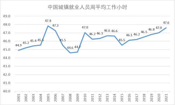 刚好,国家统计局每年都会公布城镇就业人员的周平均小时数,而且最早可查数据到2001年,这也刚好是我国加入WTO的第一年。