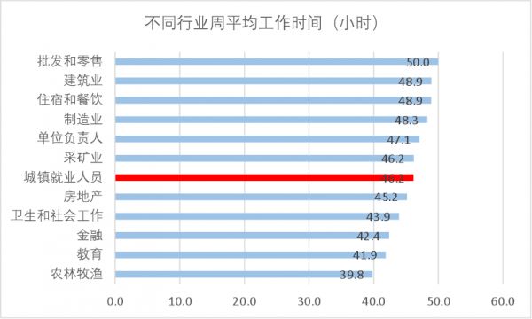 数据结果与很多直观印象都相同:比如批零、餐饮、建筑和制造业是最忙的四个行业,所以打工人都戏称自己是“搬砖的”“打螺丝”“去工地”,确实非常贴切。而教育和金融行业,由于公职和事业单位占比相对高,所以平均工作时长都只是略超40小时。