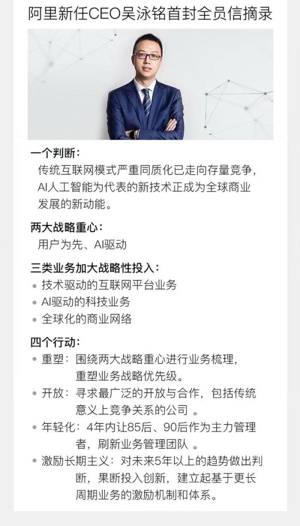 全新制定的战略中,阿里新领导层明确了两大方向,如果说用户和AI是阿里这趟列车未来的两大战略轨道,那么年轻化则是阿里内部管理者架构的总方针。