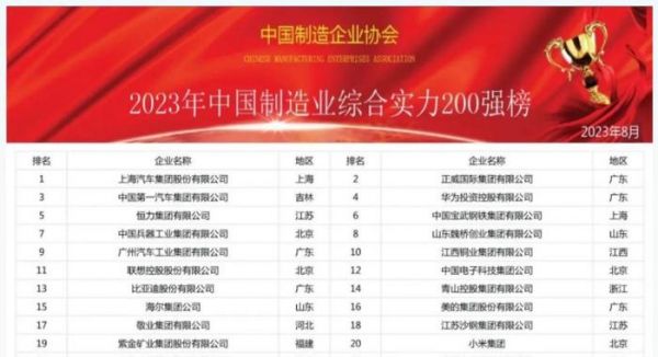 中国制造业综合实力200强榜16-20名:美的集团、敬业集团、江苏沙钢集团、紫金矿业集团以及小米集团。榜单第20名是小米集团,定位为一家以智能手机、智能硬件和IoT平台为核心的消费电子及智能制造公司。智能手机全球出货量稳居全球前五,集团业务已进入全球逾100个国家和地区。通过独特的“生态链模式”,小米带动了更多志同道合的创业者,同时建成了连接超上亿台智能设备的IoT平台。
