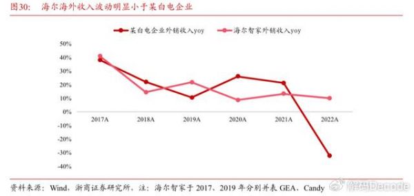 如果对比数据也能发现,从海尔(海外自主品牌)和某白电企业(海外OEM为主)的外销收入波动,可以看出自主品牌收入波动明显小于代工业务。