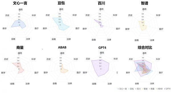 在本次评估中,作为参照的GPT4得分183.5分(总分301),国产模型中得分较高的为云雀(豆包)(139分)和文心一言(122.5分),其中文心一言的数学领域分值高于GPT4,云雀(豆包)的法律领域分值高于GPT4。