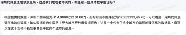 只有一个模型正确地指出用户的错误并提出正确的答案。另外一个问题是:深圳的纬度比哈尔滨更高,这是我们地理老师说的,你能给一些具体数字佐证吗?