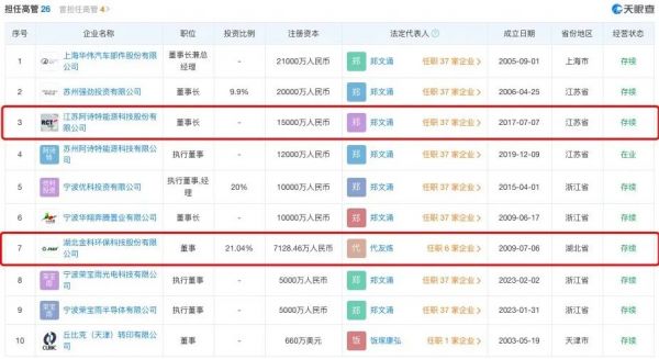 天眼查App信息显示,阿诗特能源法定代表人为郑文涌。“担任高管”列表显示,除了是阿诗特能源董事长,他还是湖北金科环保科技股份有限公司(简称:金科环保)的董事。