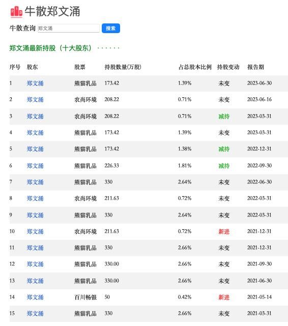 此后,郑文涌本人也多次现身于上市公司的十大流通股股东中。2021年以来,他新进持有百川畅银、农尚环境股份,连续三次减持熊猫乳品股份。