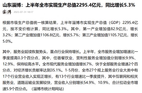从数据来看,可能要让不少人有些意外了——上半年GDP为2295.4亿元,同比增长5.3%,跑输5.5%的全国大盘增速,也大幅落后6.2%的山东平均增速,增速位列山东倒数第三。