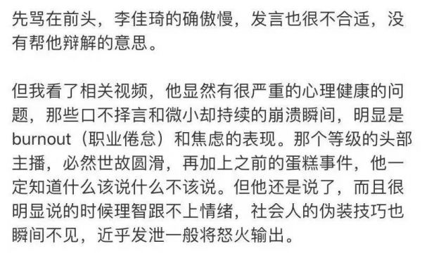 在此次事件的讨论中,有博主提到李佳琦的表现其实是一种倦怠(burnout),他已经不想直播了,但依然被绑住直播。