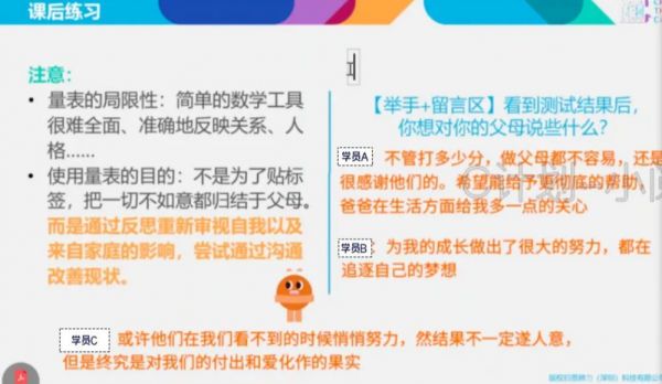 (经过课堂讨论,孩子们也能渐渐理解父母;橘色字体记录了孩子们的思考)
