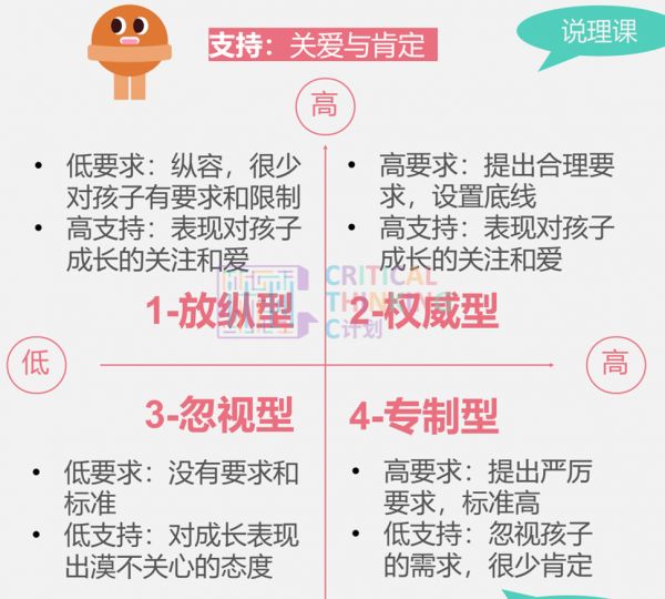 在课堂上,我们带领孩子批判性阅读王朔著《我是你爸爸》时,将父母的教养模式以“支持”与“要求”作为标识分为四种。即高要求、高支持的权威倾向型;低要求、高支持的放纵倾向型;低要求、低支持的忽视倾向型;高要求、低支持的专制型。