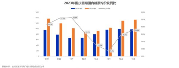 据同程旅行提供给“出行一客”的数据显示,截至9月12日,中秋国庆假期出行的机票均价较“五一”假期上涨13%。航班管家也得出了相同的结论,国庆假期经济舱平均票价1133元,同比2019年增长32.7%。价格变化趋势与2019年相同,价格高峰出现在节前1天,假期后两天。