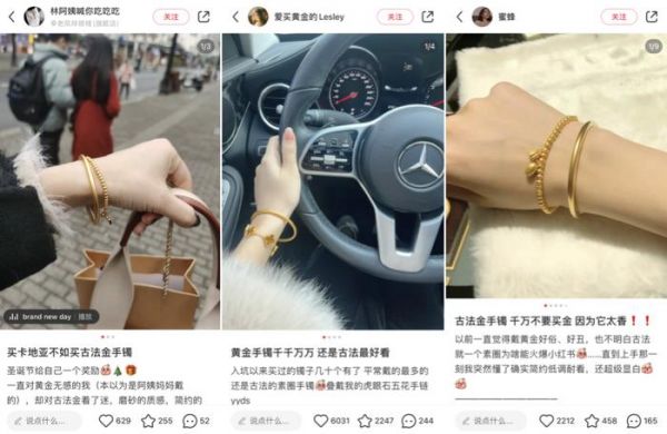 据媒体报道,在春节热销阶段周大福的古法黄金手镯曾一天卖掉6000件,作为当时爆款,古法黄金开始被逐渐接受。国内几大以黄金为主业的珠宝金行随即全部入局。周生生、六福和老凤祥都推出了相应的产品,并且直接起名“古法黄金”。在当时的宣传内容中,古法黄金产品抛弃了传统黄金“土”的特质,开始与时尚潮流文化相结合。