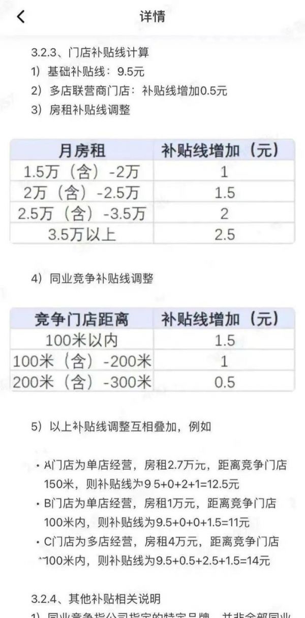 原有的基础补贴、多店补贴、房租补贴、同业竞争补贴调整后变成可叠加,其中 " 同业竞争补贴 " 直接针对瑞幸——库迪加盟商 100 米距离内有瑞幸门店的,增加 1.5 元补贴、200 米内的增加 1 元补贴、300 米内的增加 0.5 元补贴。同时,房租补贴线上调,并新增了外卖平台补贴。