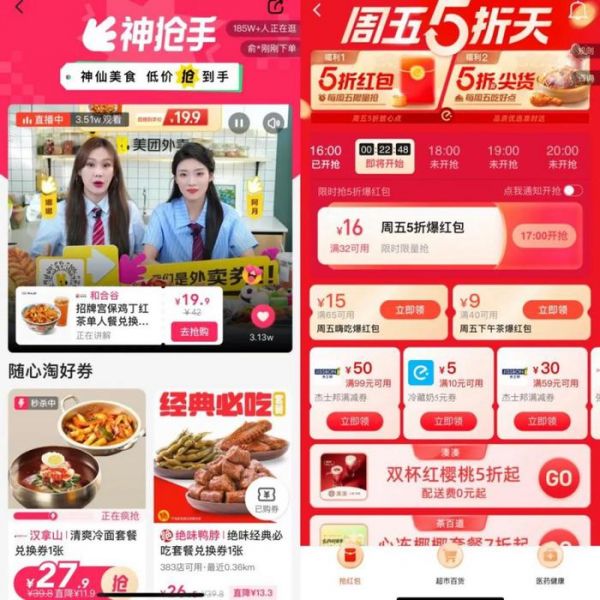 另外,美团的 " 神抢手 " 直播间每天都提供大量的外卖折扣券,饿了么则持续有各种免单、5 折等促销活动。如果在周六日打开美团或者饿了么,往往还会有额外的周末狂欢。