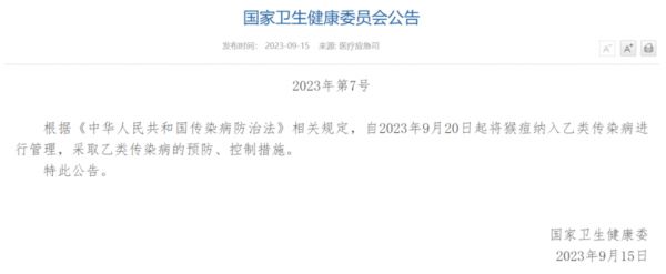 9月15日,国家卫生健康委员会发布2023年第7号公告:自2023年9月20日起将猴痘纳入乙类传染病进行管理,采取乙类传染病的预防、控制措施。