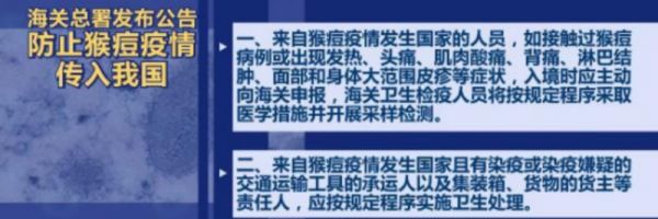 8月20日,中国海关总署发布公告,规定来自猴痘疫情发生国家或地区的有关人员,入境中国时应主动向海关申报。