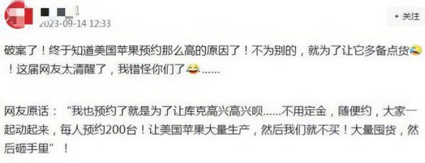 当然,这样对比并不公平。一方面Mate 60 Pro至今还没有开正式的发布会,供应链的最新消息是目前Mate 60 Pro已经加单到了1500万台-1700万台,还有一波更强的增长等在后面。另一方面也有网友质疑苹果预约数字的真实性,毕竟由于苹果预定并不需要提前支付任何定金,所以出现了很多自称在京东预定了数百台iPhone 15手机的网友,带来了不少欢乐。