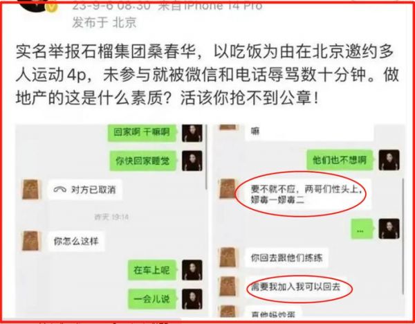 “云核变量集团”董事长刘夏(女)在个人社交账号上公开举报“石榴集团”桑春华,以吃饭为由在北京邀约“多人运动”,说因其“未参与就被微信和电话辱骂了说十分钟。做地产的这是什么素质?活该你抢不到公章。”