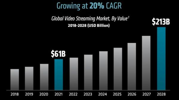 据Bluewave咨询和研究2022年3月对全球视频流媒体市场的分析,2021年该市场的价值为610亿美元,到2028年将达到2130亿美元,这期间的复合年增长率为20%。其中,70%的视频市场是直播,其他30%是按需服务的市场。