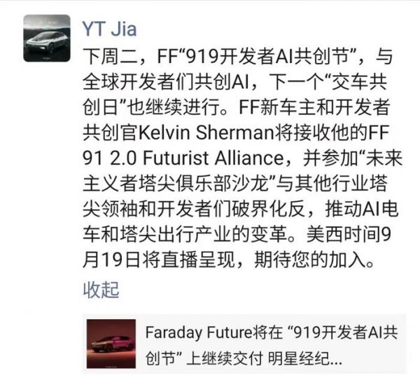 FF创始人兼CPUO贾跃亭在个人社交平台上表示,“下周二,FF“919开发者AI共创节”,与全球开发者们共创AI,下一个“交车共创日”也继续进行。FF新车主和开发者共创官Kelvin Sherman将接收他的FF 91 2.0 Futurist Alliance,并参加“未来主义者塔尖俱乐部沙龙”与其他行业塔尖领袖和开发者们破界化反,推动AI电车和塔尖出行产业的变革。美西时间9月19日将直播呈现,期待您的加入。”
